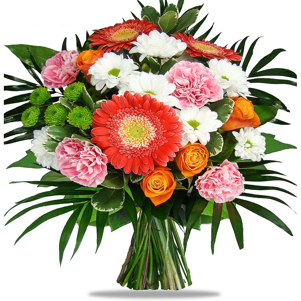 Cтандартний 3 гербера міні, 2 гвоздика, 3 сантіні (хризантема), 3 троянда, зелені наповнювачі