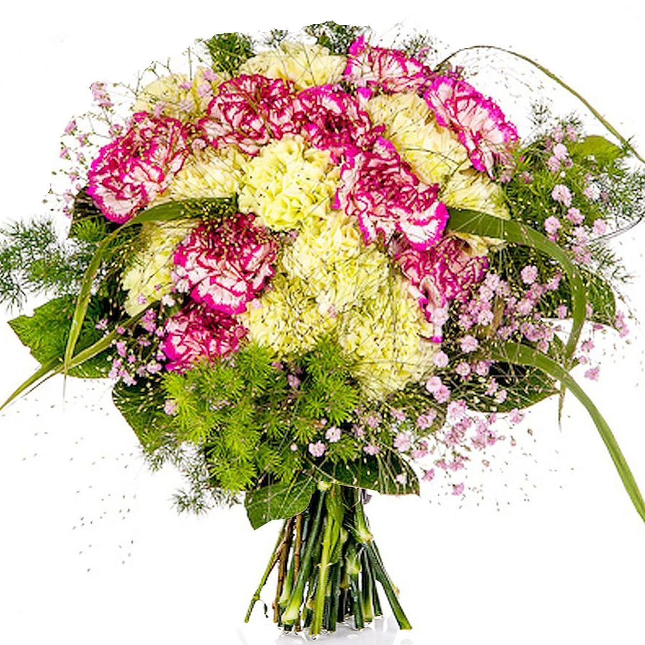 | Standardní | 9 ks karafiátů, 1 ks gypsophila a dekorativní zeleň (asparagus umbelathus, pistacie, bear grass, salal) |