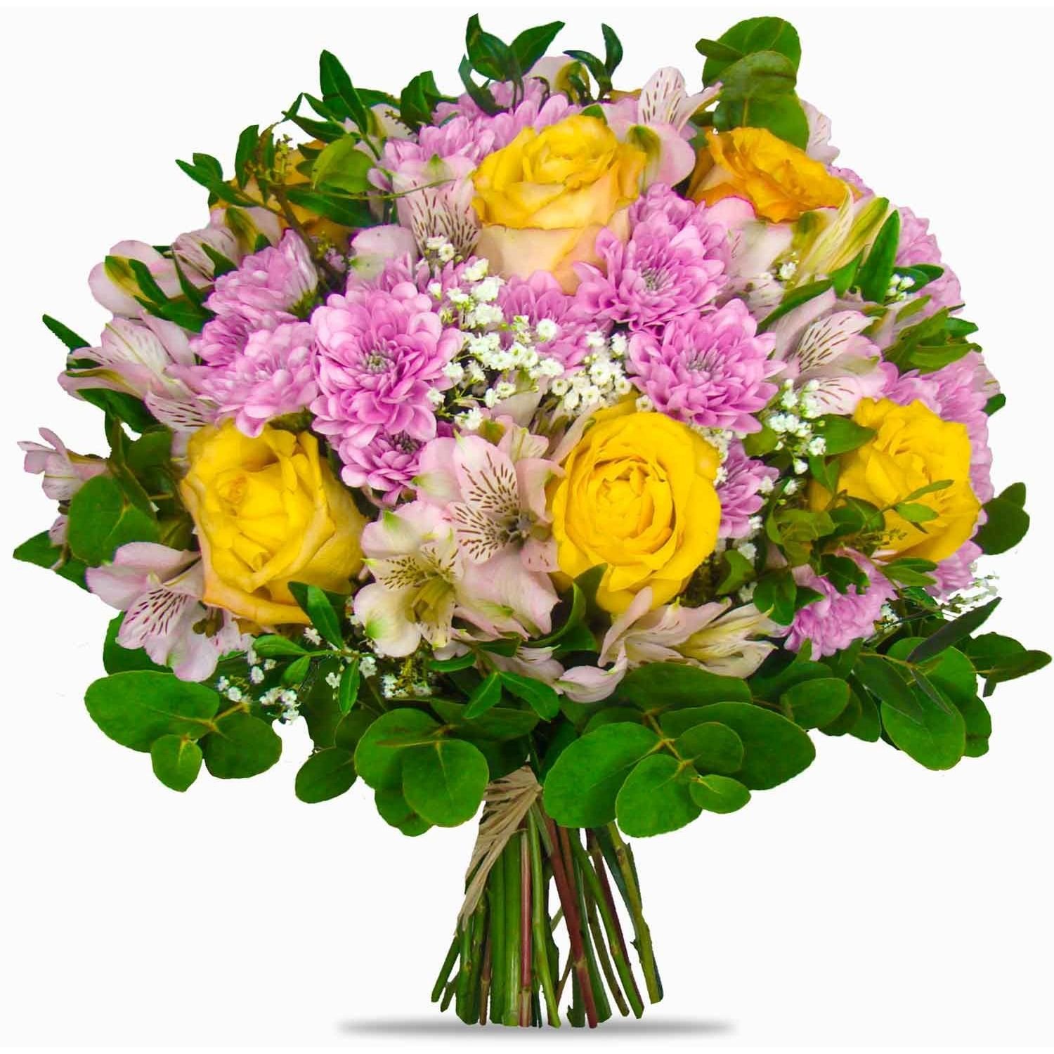 Velká 5 ks růže, 4 ks alstromerie, 4 ks chrysanthéma, 2 ks gypsophila a dekorativní zeleň