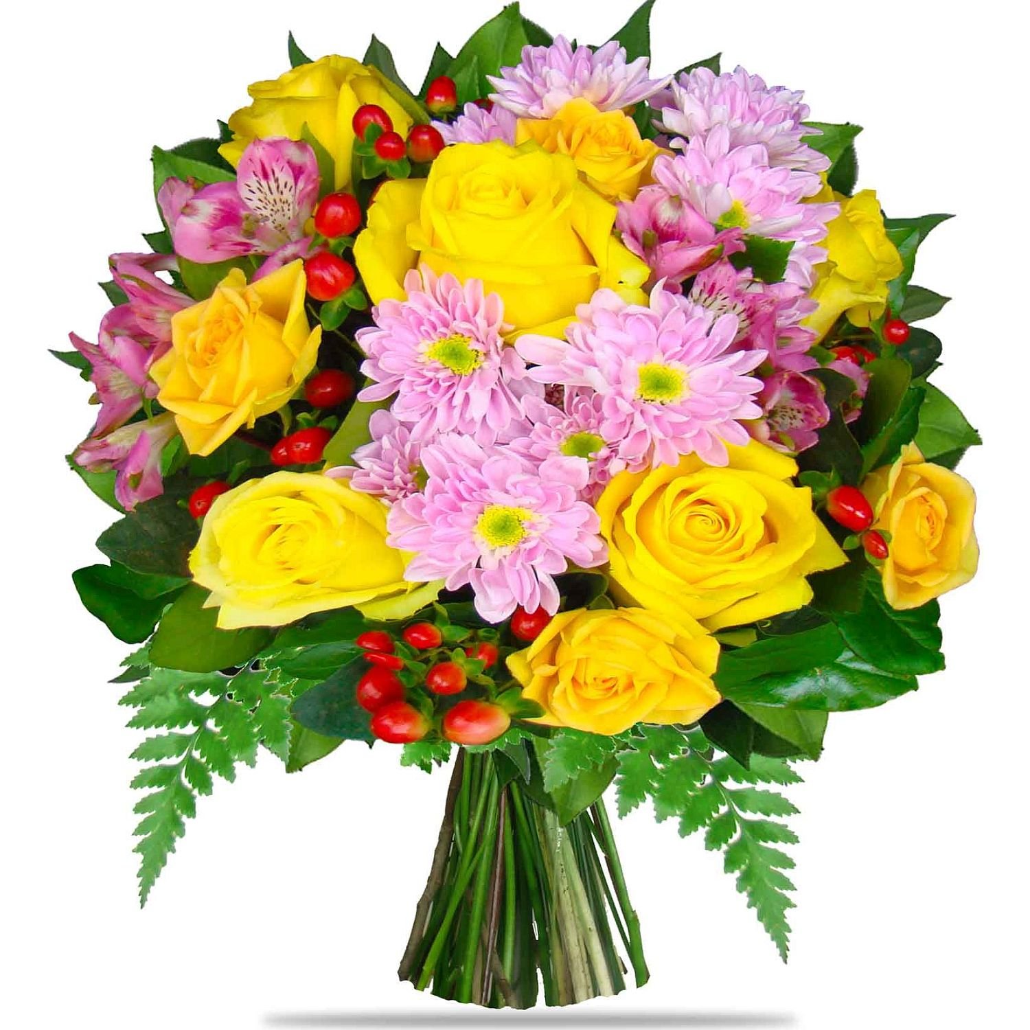 Exkluzivní 7 ks růže, 6 ks alstromerie, 4 ks hypericum, 3 ks chrysantéma a dekorativní zeleň.