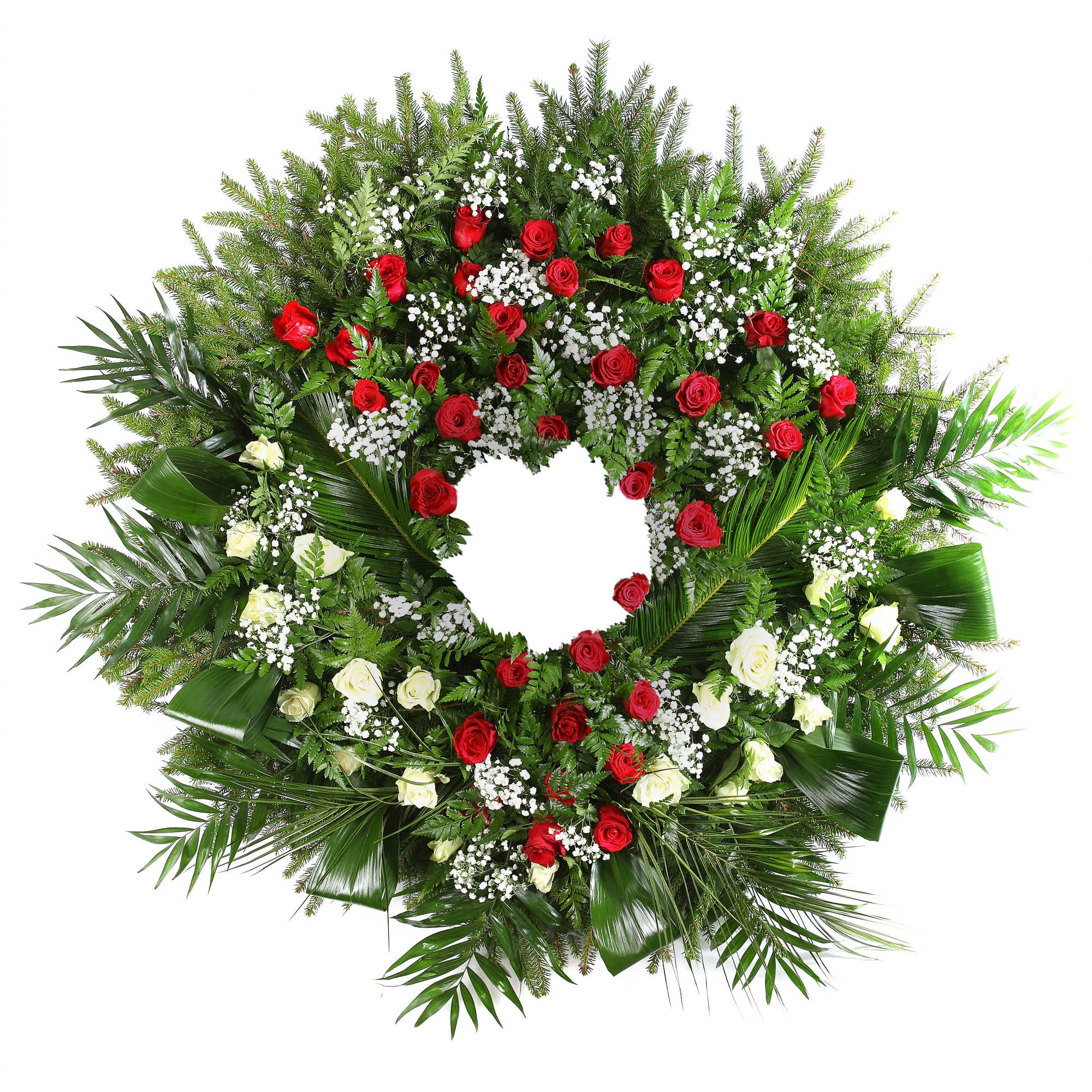 | Standardní | 10 ks bílé růže, 20 ks červené růže, 9 ks gypsophila, dekorativní zeleň a smuteční stuha. Velikost cca. Ø 50 cm |