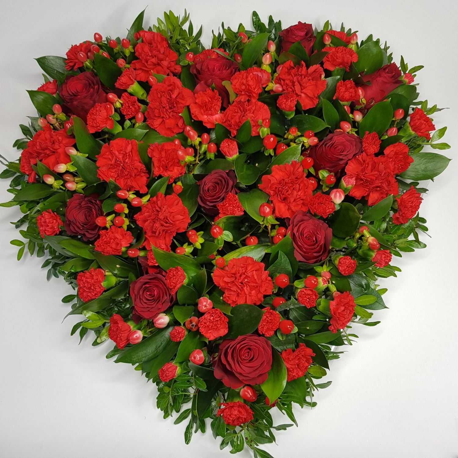 Aranžmá Fatima, je tvořeno z červených růží, červených karafiátů a mini karafiátů dále z červeného hyperica a zeleně. Vše je naaranžované do hmoty ve tvaru srdce, která je nasáklá vodou a proto květy déle vydrží.