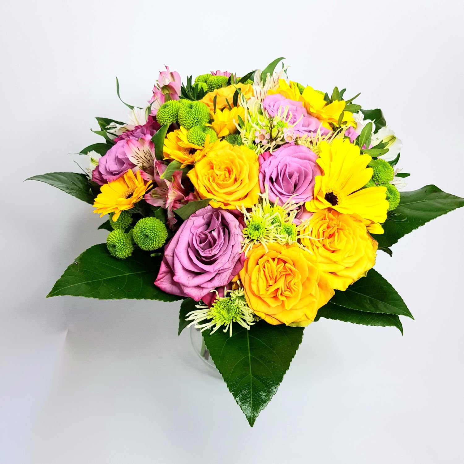 Dárková kytice Ctirada je tvořena ze žlutých gerber, žlutých a fialových růží, zelených chrysanthém a růžových alstromerií. Květy jsou doplněné zelení.