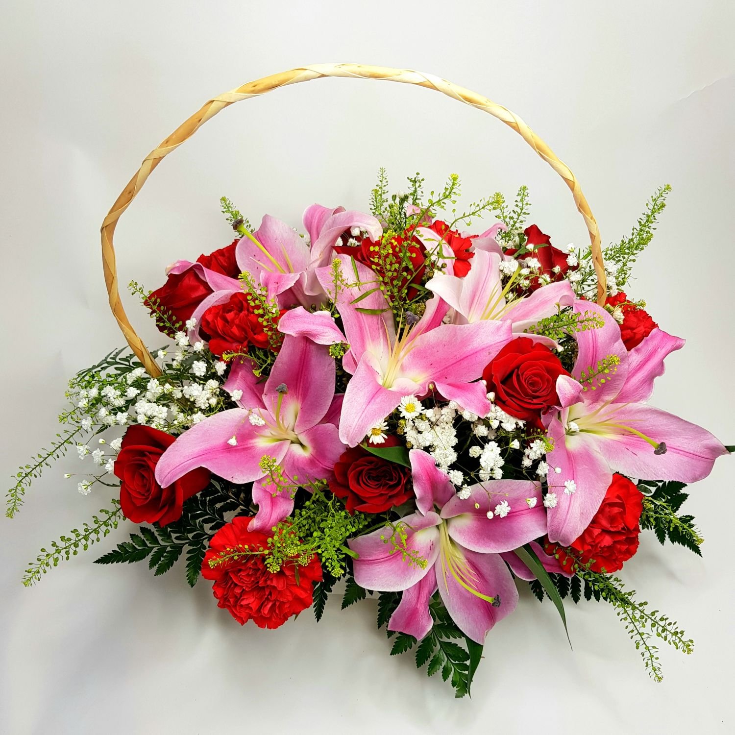 Květinový koš Afra je tvořen z červených karafiátů, červených růží a lilií. Květy jsou doplněné zelení. Vše je naaranžované do proutěného košíku. Květy jsou vypichované do hmoty, která je nasáklá vodou a proto dlouho vydrží.