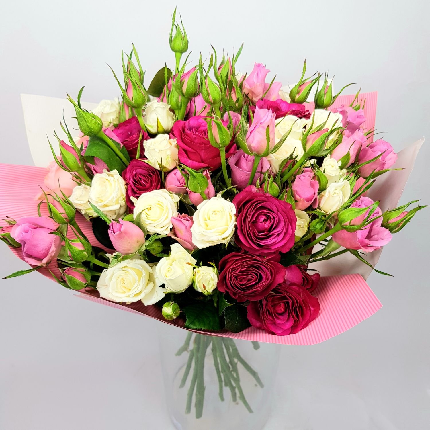 Kytice Adolfína je tvořena z 15ti trsových mini růží. Květy jsou doplněné barevnou manžetou.