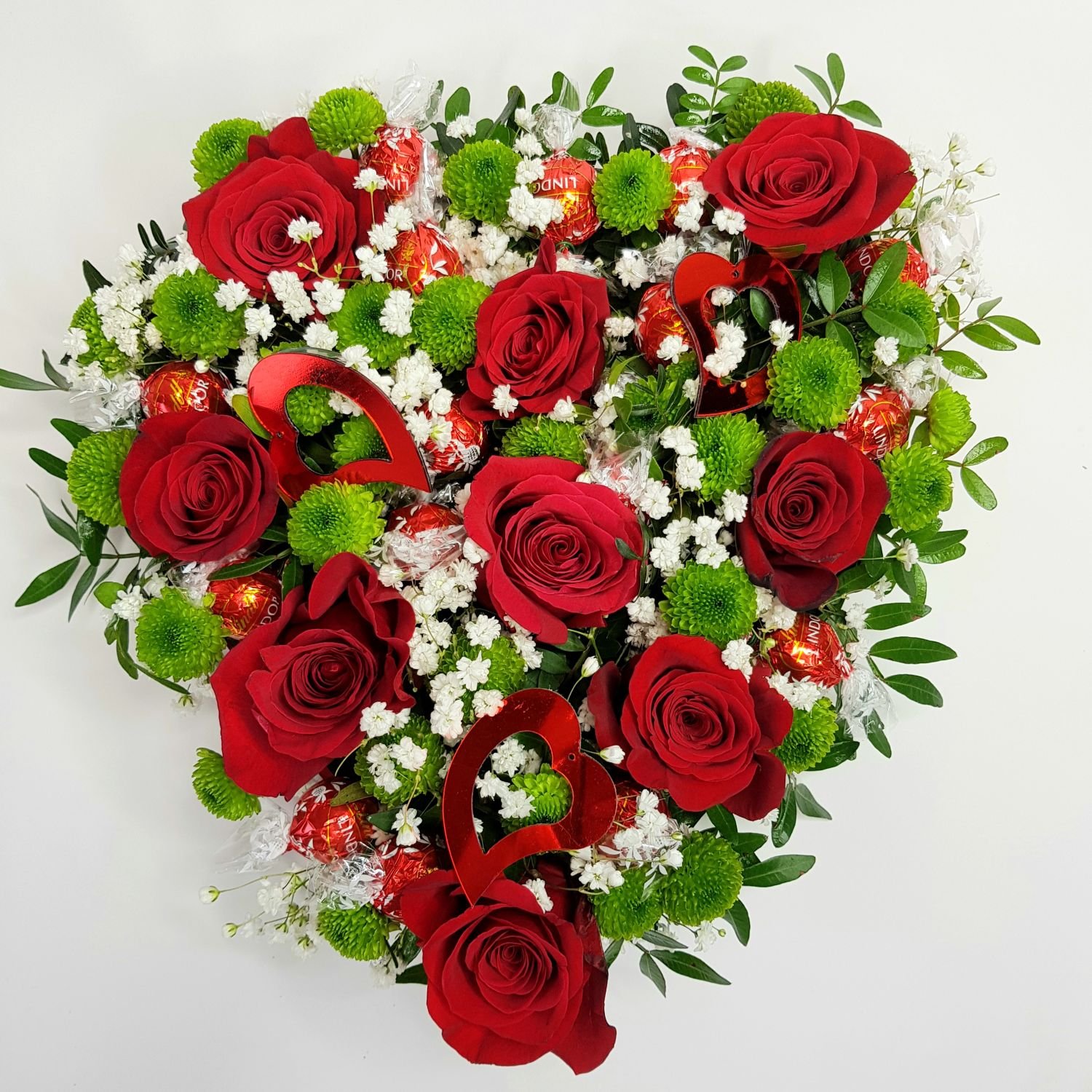 Srdce Vlastislava je tvořeno z červených růží a bonbónů značky Lindt. Vše je přizdobené zelenou chrysanthémou a gypsophilou.