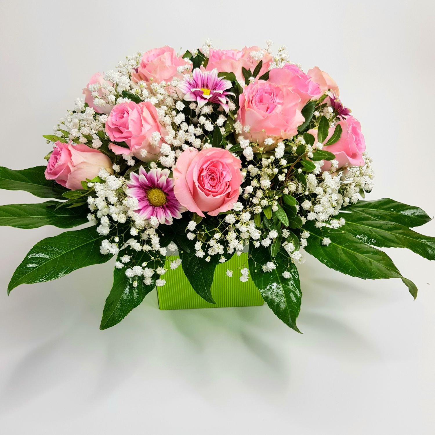 Květinový box Evženie je tvořen z 11ti růžových růží, růžových chrysanthém a gypsophilou. Květy jsou doplněné zelení. Vše je naaranžované do okrasného boxu kde je hmota, která je nasáklá vodou a proto květy dlouho vydrží.