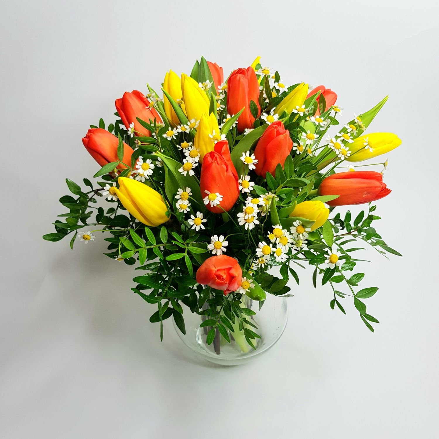 Dárková kytice Hermína je tvořena ze žlutých a oranžových tulipánů, které jsou doplněné heřmánkem a zelení.