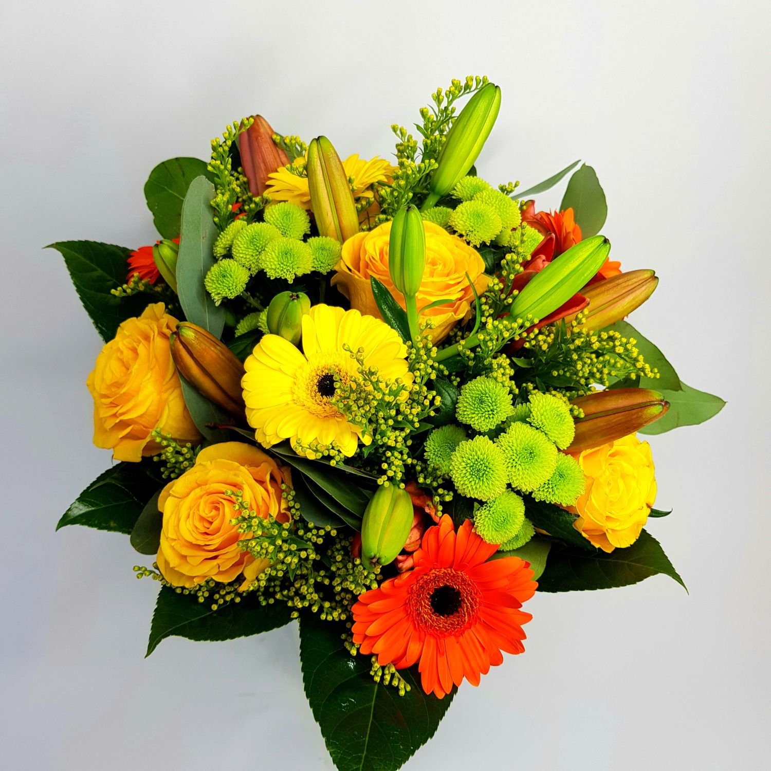Kytice Irma je tvořena ze žlutých růží, oranžových lilií, oranžových a žlutých gerber, zelených chrysanthém a solidagem. Květy jsou doplněné zelení.