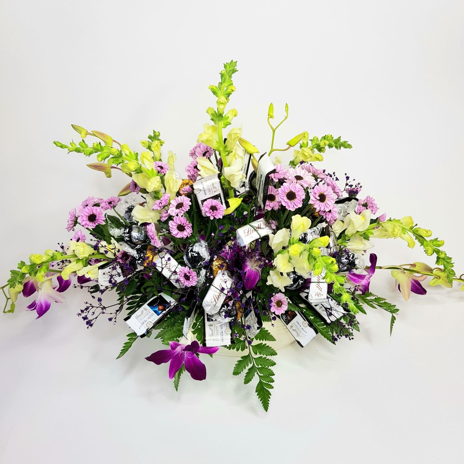 Vypichované aranžmá Lenka je tvořeno z drobných květů a hlavně z bonbónů značky Lindt.