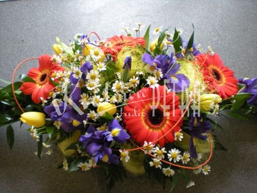 Aranžmá na stůl číslo 77.A. je tvořeno z modrých irisů, žlutých tulipánů, heřmánku a oranžových gerber. Květy jsou doplněny zelení a kokosovým vláknem. Toto vypichované aranžmá (výzdoba) se hodí na svatební stůl, ale i na jinou mimořádnou událost např. narozeniny či na oslavu narození dítěte.
