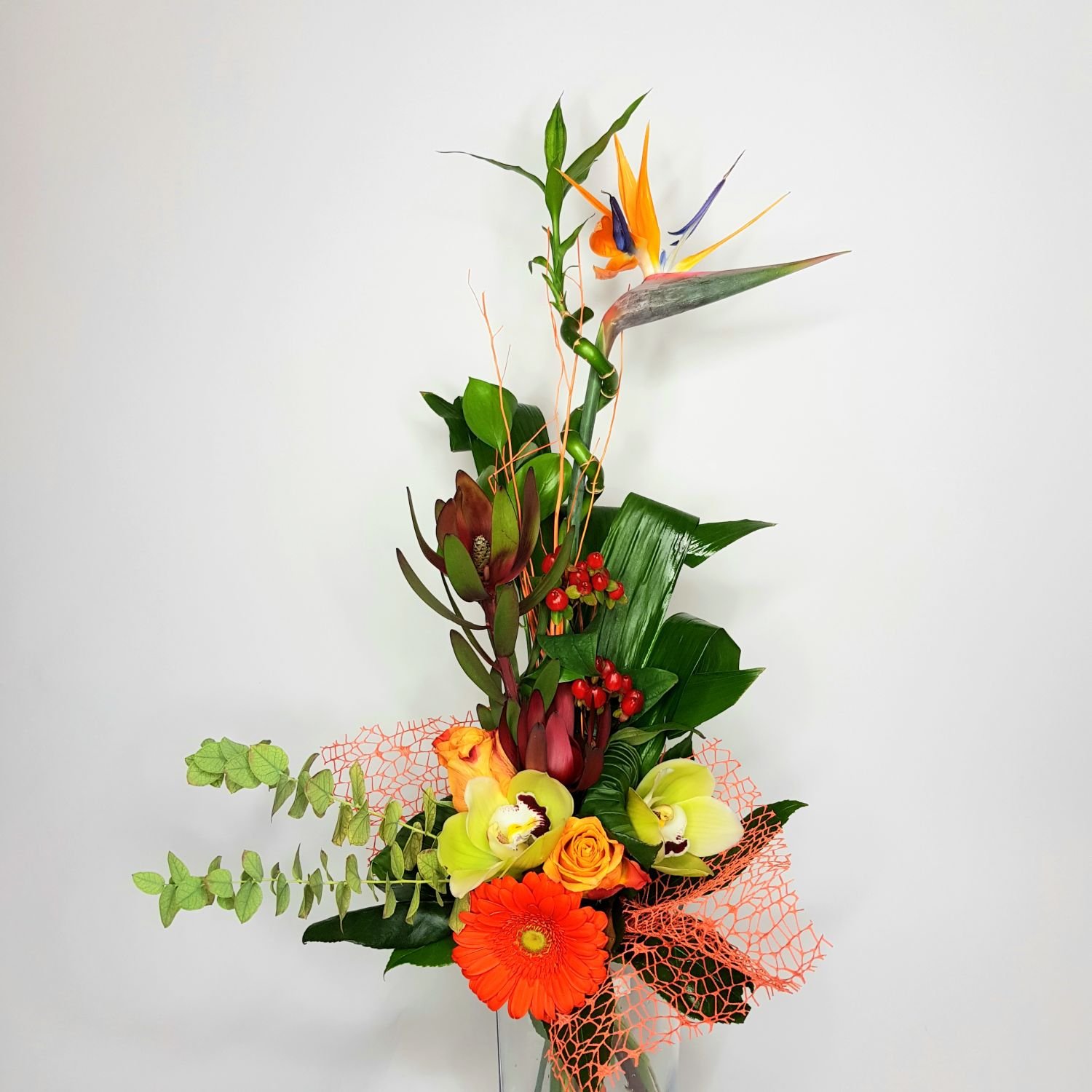 Dárková kytice Vanesa je tvořena ze Strelitzie, leucadendronu, hyperica, gerbery a oranžových růží. Květy jsou doplněné zelení a manžetou. Tento produkt, prosím objenávejte alespoň 2 dny před datem doručení či vyzvednutí.