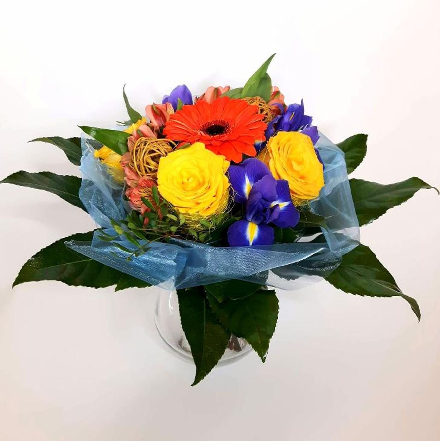 Dárková kytice Taťána je tvořena z oranžové gerbery, modrých irisů, žlutých růží a oranžových alstromerií. Květy jsou přizdobené zelení. Tato květiny se hodí jak pro dámu, tak pro slečnu jak k narozeninám i k jmeninám. .