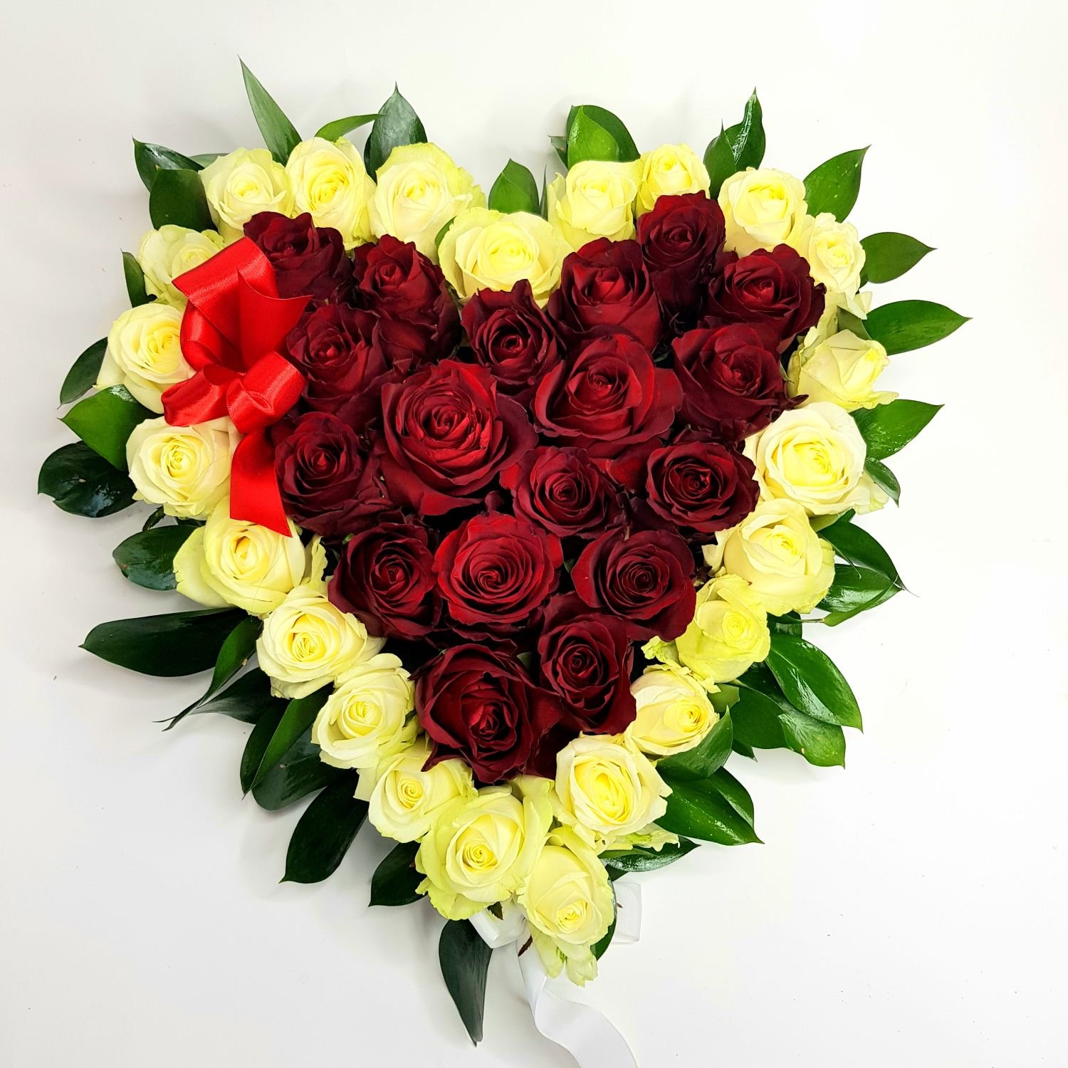 Aranžmá Srdce je tvořeno z červených a bílých růží. Růže jsou naaranžované do tvaru srdce a vypichované do hmoty, která je nasáklá vodou a proto dlouho vydrží.