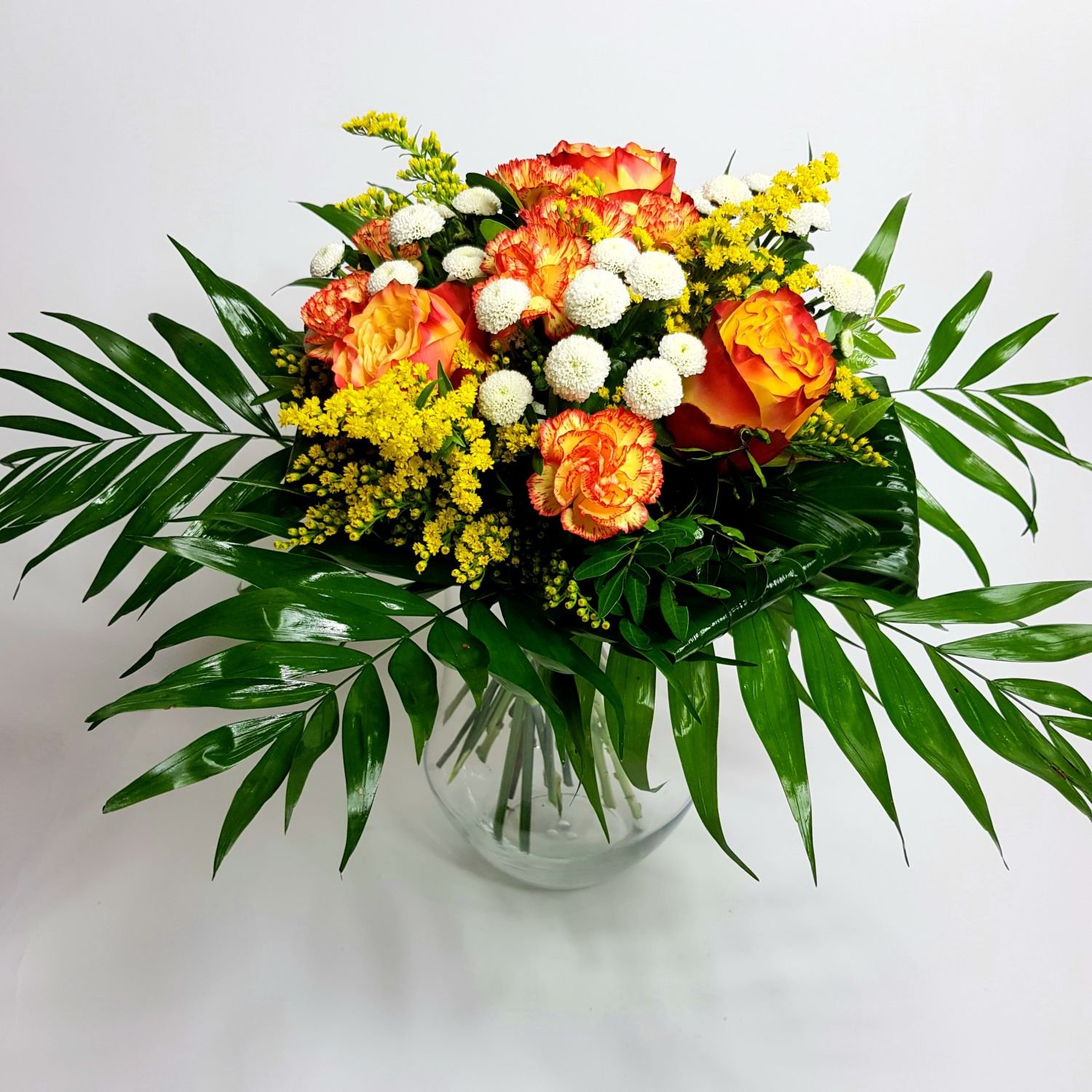 Dárková kytice Sabina je tvořena z oranžových růží, oranžových mini karafiátů, solidaga a chrysanthém. Květy jsou doplněné zelení.