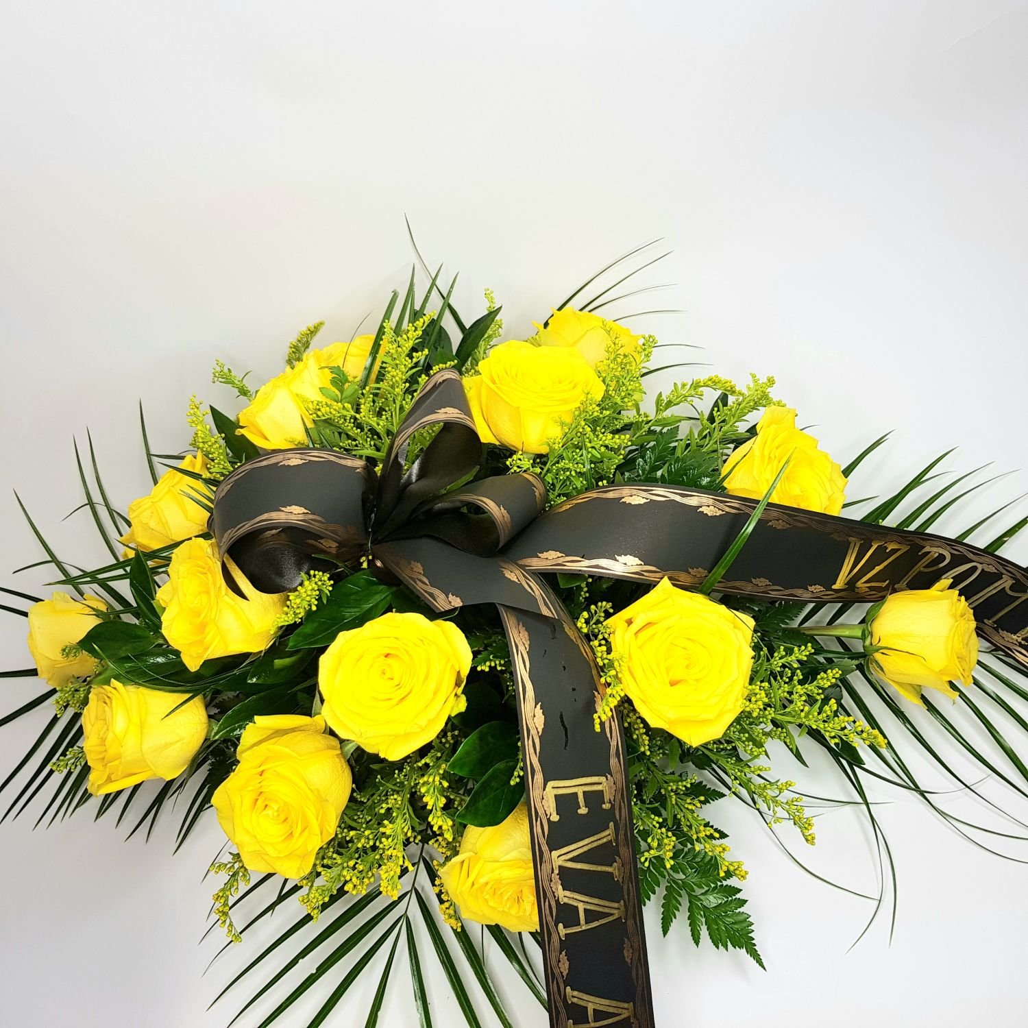 Smuteční kytice vypichovaná číslo 51. je tvořena ze žlutých růží a solidaga. Květy jsou doplněné zelení a smuteční stuhou s nápis dle Vašeho přání. Květy jsou naaranžované do hmoty, která je nasáklá vodou a proto déle vydrží.