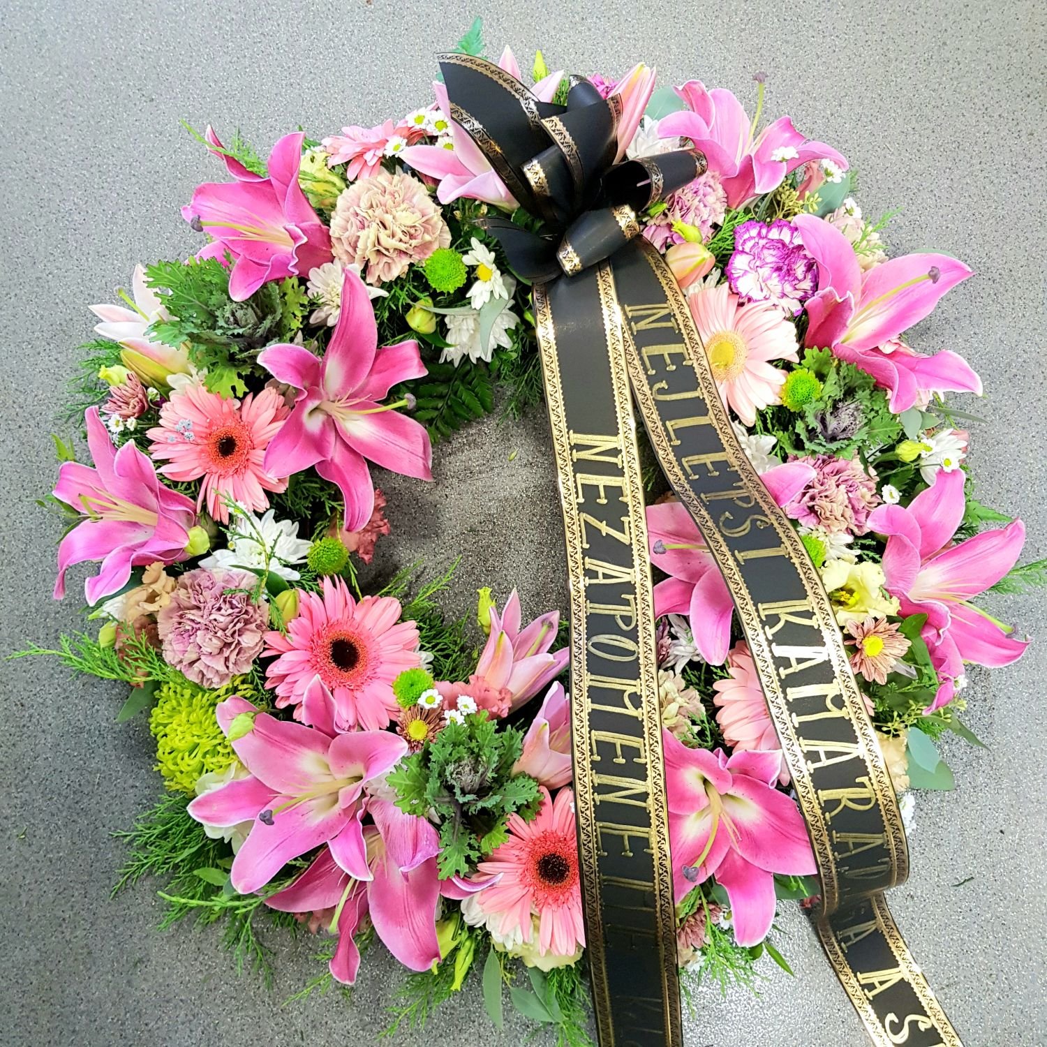 Smuteční věnec číslo 47. je tvořen z růžovo-bílých květů. Jako jsou lilie, růže, gerbery a chrysanthémky. Květy jsou vypichované do hmoty, která je nasáklá vodou a proto květy dlouho vydrží. Tento věnec má průměr 60cm. Text na stuhu Vám napíše dle Vašeho přání.