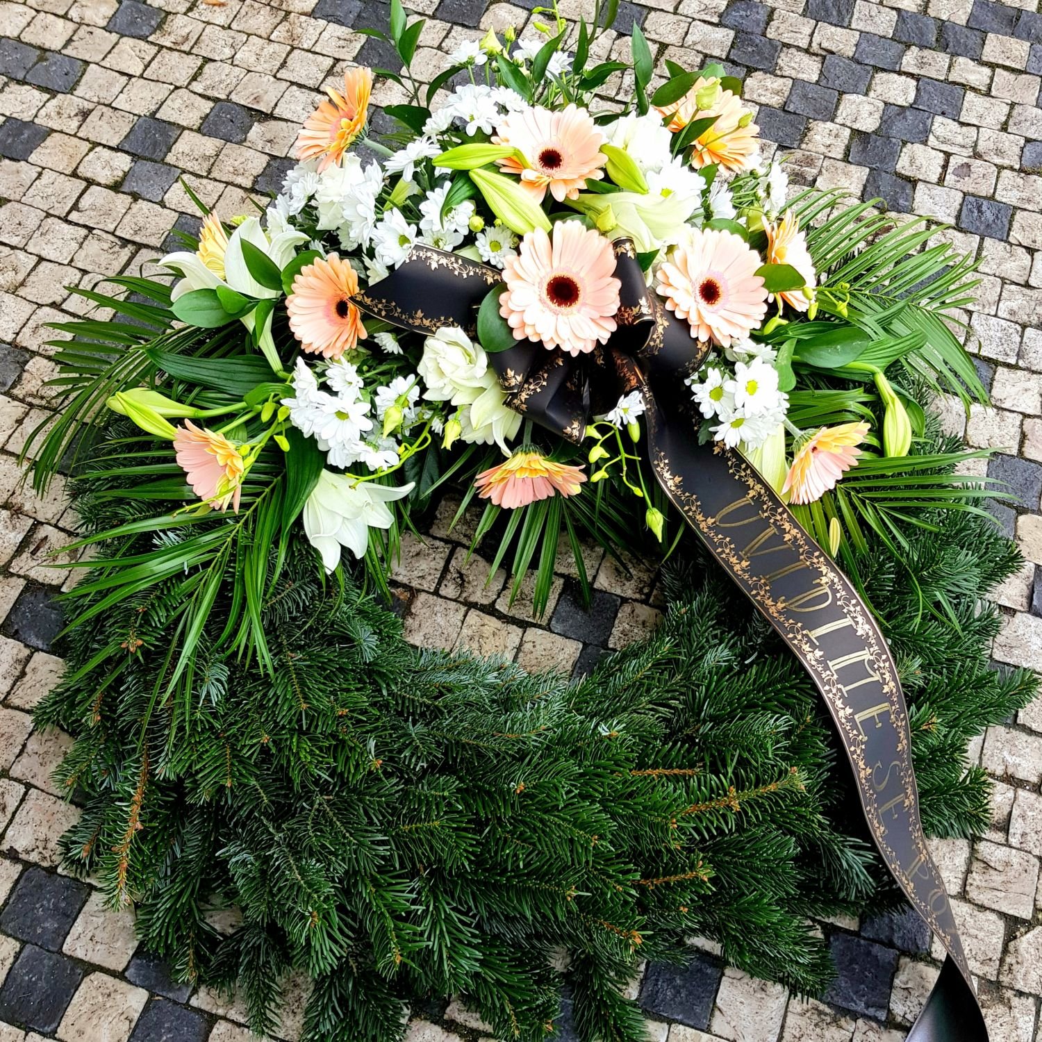 Smuteční věnec číslo 36. je tvořen z bílých chrysanthém, krémových gerber, bílých lilií a bílé eustomy. Květy jsou doplněné zelení a stuhou s nápisem dle Vašeho přání. Květiny jsou vypichované do hmoty, která je nasáklá vodou a proto dlouho vydrží. Tento věnec má průměr 70cm.