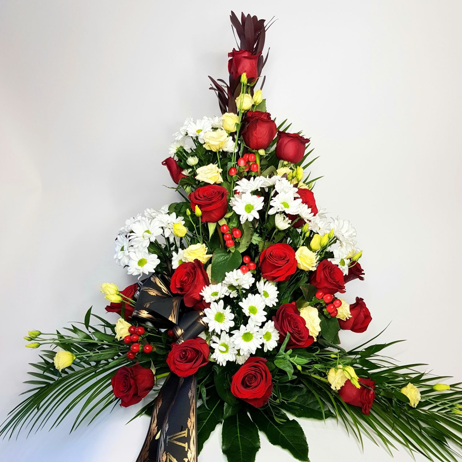 Smuteční kytice vypichovaná číslo 29. je tvořena z bílých chrysanthém, červených růží, bílých eustom, červeného hyperica a leucadendronu. Smuteční kytice je doplněna zelení a černou smuteční stuhou na kterou Vám napíšeme nápis dle Vašeho přání.