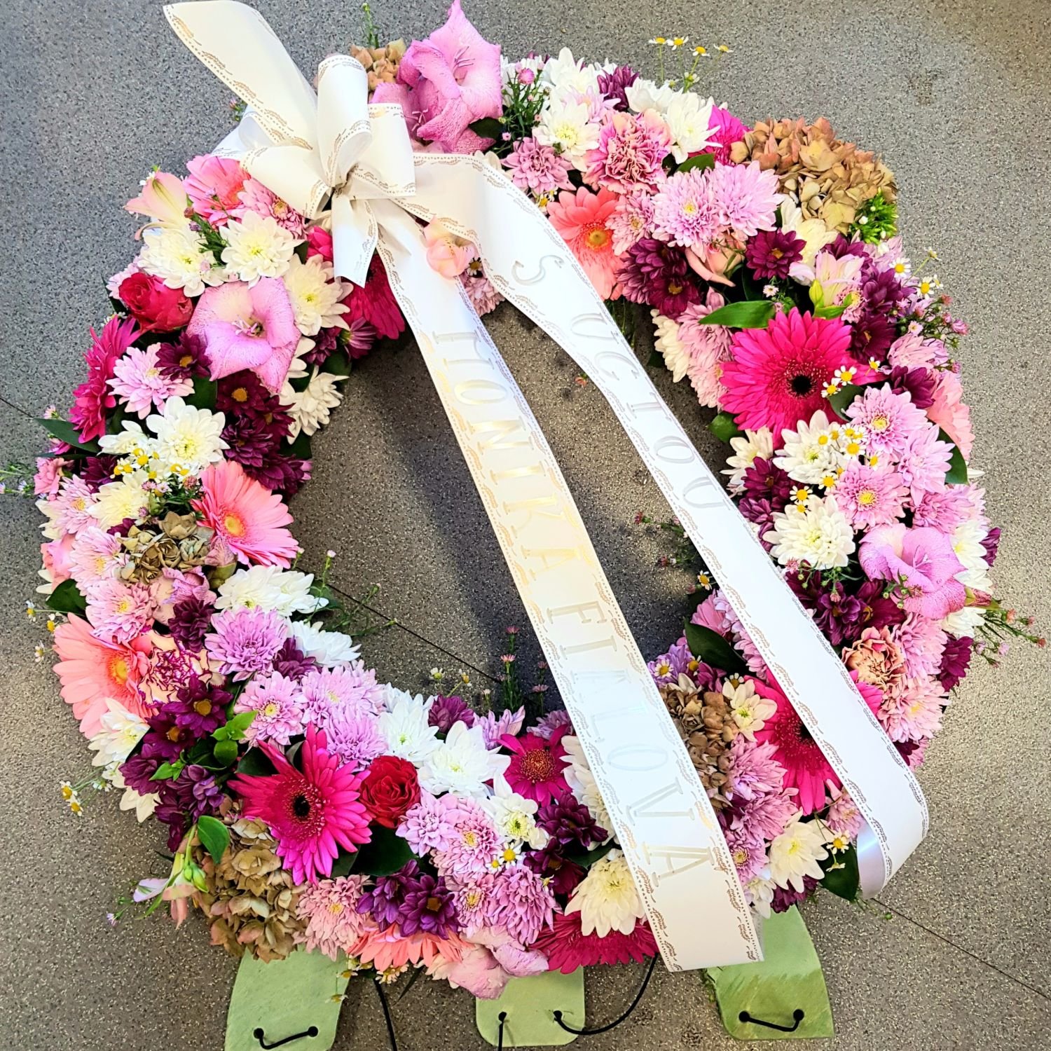 Smuteční věnec vypichovaný číslo 28. je tvořen z růžových a fialových gerber, bílých a růžových chrysanthém, růžových růží, hortenzií a zelení. Na smuteční stuhu píšeme nápis dle přání zákazníka. Tento smuteční věnec déle vydrží, jelikož je vypichovanán do hmoty jménem Oasis, která je nasáklá vodou. Průměr tohoto věnce je 55cm.