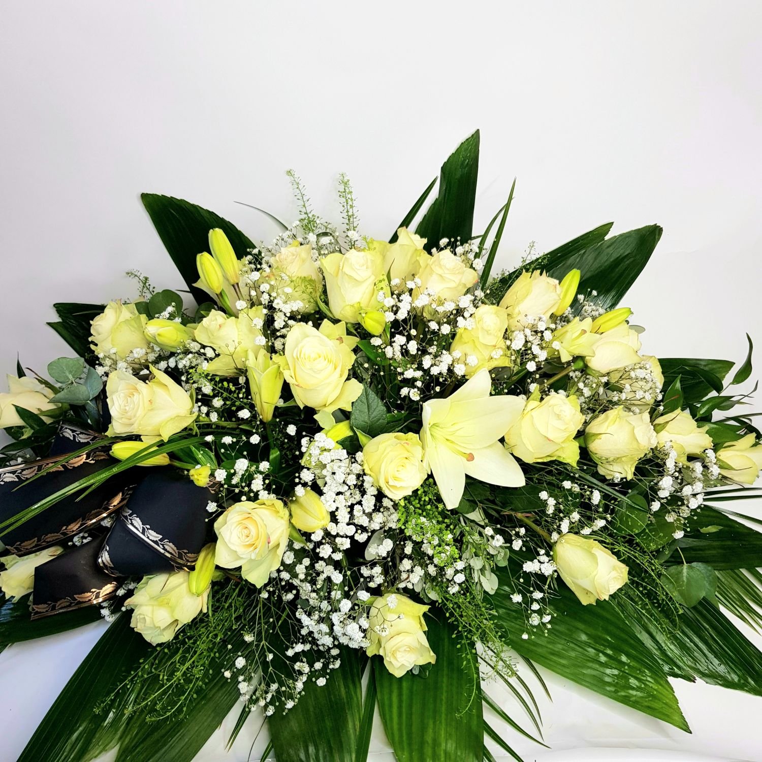 Smuteční kytice vypichovaná číslo 22. je tvořen z bílých růží a bílých liií, které jsou společně s doplňkovou zelení vypichované do držáku od firmy Oasis. Držák je nasáklý vodou a proto květy vydrží i několik dní. Na smuteční stuhu Vám napíšeme text dle Vašeho přání.