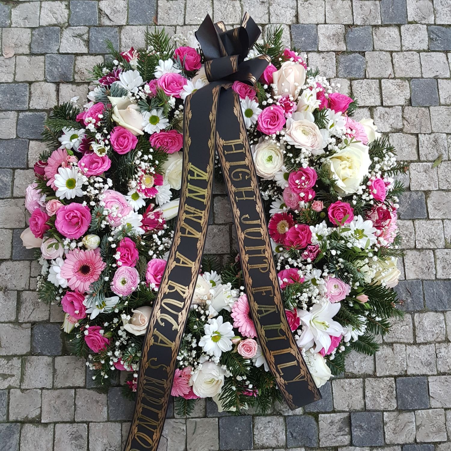 Smuteční věnec číslo 14. je tvořen z růžových a bílých růží, růžových mini gerber, bílých chrysanthém, růžových lilií, gypsophilou a zelení. Květy jsou vypichované do hmoty jménem Oasis a proto dlouho vydrží. Tento věnec má průměr 70cm. Na smuteční stuhu Vám napíše text dle Vašeho přání.