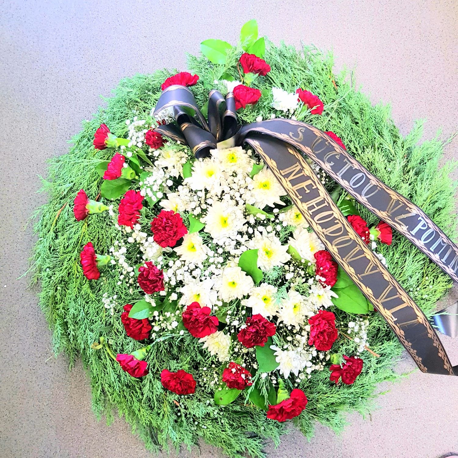 Smuteční věnec číslo 10. je tvořen z chvojí a z červených karafiátů, bílých chrysanthém, gypsophilou a smuteční stuhou na kterou Vám napíšeme nápis dle Vašeho přání. Květy jsou vypichovány do hnoty jménem Oasis, která je nasáklá vodou a proto květy dlouho vydrží. Tento věnec má průměr 70cm.