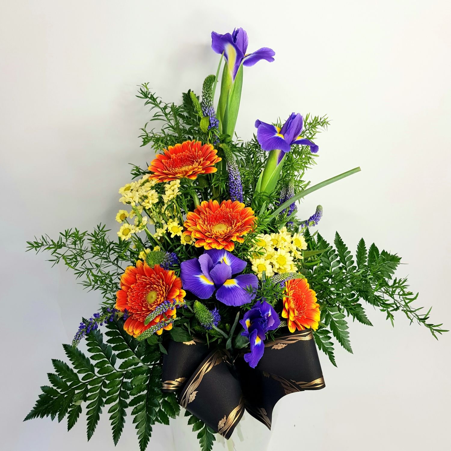 Smuteční kytice vázaná v ruce číslo 4 je tvořena z modrých irisů, oranžových mini gerber, žlutých santinek a modrých květů Veroniky. Květy jsou doplněné zelení a smuteční stuhou s nápisem dle Vašeho přání.