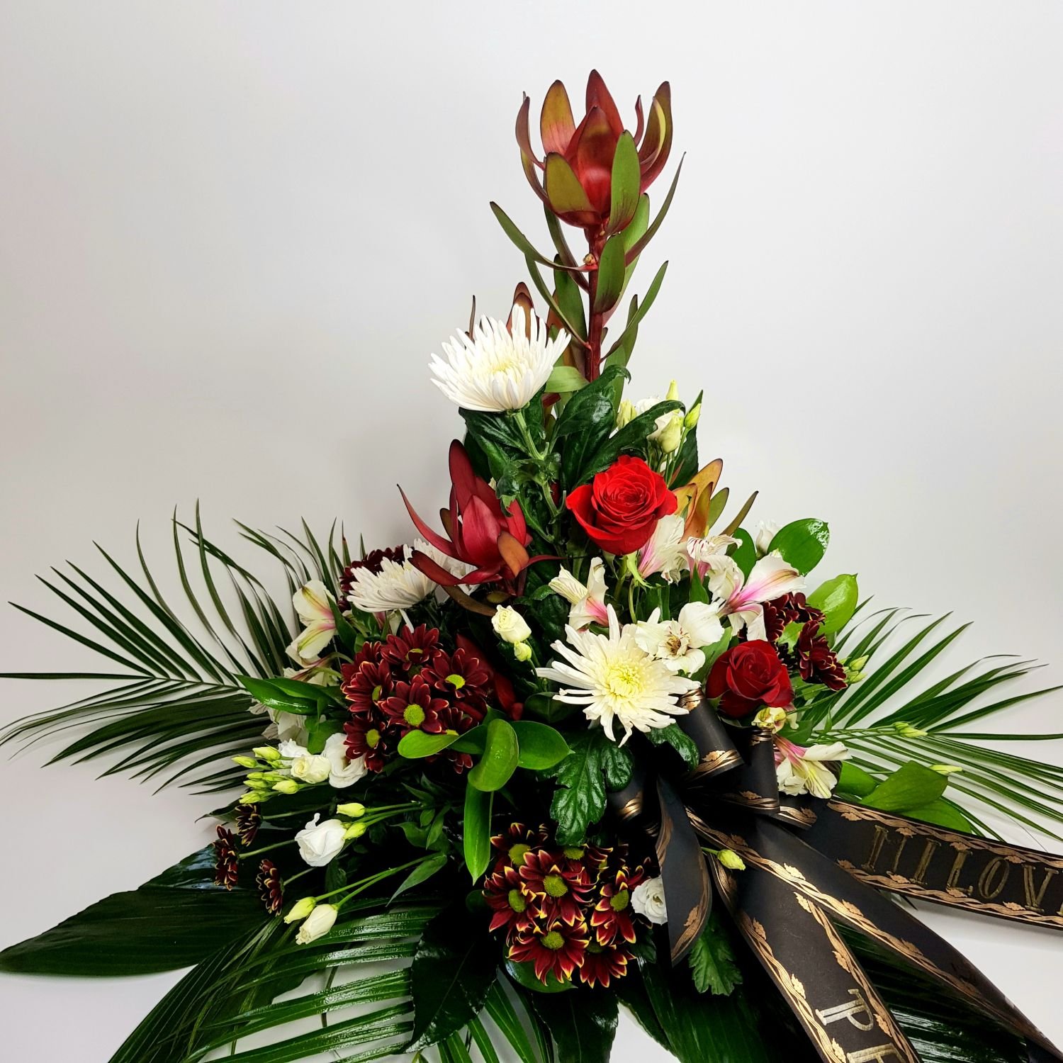 Smuteční kytice vypichovaná číslo 9. je tvořena z bílých jednokvětých chrysanthém, tmavých drobných chrysanthém, leucadendronu, bílých alstromerií, bílé eustomy a červených růží. Vše je doplněné zelení a smuteční stuhou s nápisem dle Vašeho přání.