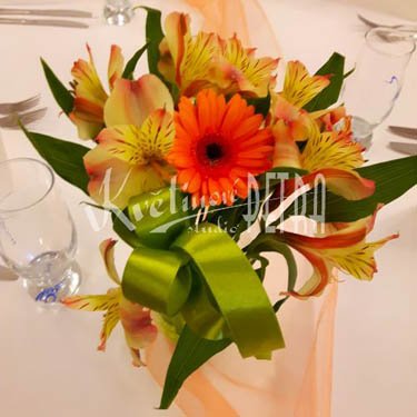 Svatební aranžmá na stůl č. 118 je tvořeno z alstromerií a gerbery. Květy jsou naaranžované do skleněné vázy, kterou vám zapůjčíme. Květy ve vázičkách vždy ladíme dle svatební kytice.