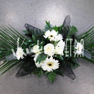 Svatební aranžmá na stůl číslo 103.A. je tvořeno z bílých gerber, bílých růží a bílé hortenzie. Květy jsou doplněné zelení a černou organsou. Toto aranžmá se hodí pro černobílou kombinaci svatební kytice jako je číslo 513. nebo 340.