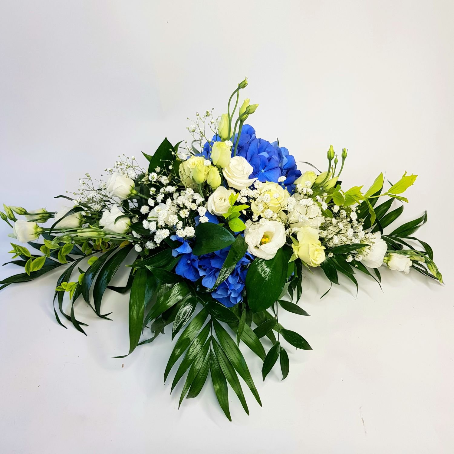 Svatební aranžmá na stůl číslo 91. je tvořeno z modrých hortenzií, bílých růží, bílé eustomy, gypsophily a stuhy. Květy jsou doplněné zelení. Vše je naaranžované do hmoty, která je nasáklá vodou a proto květiny dlouho vydrží.