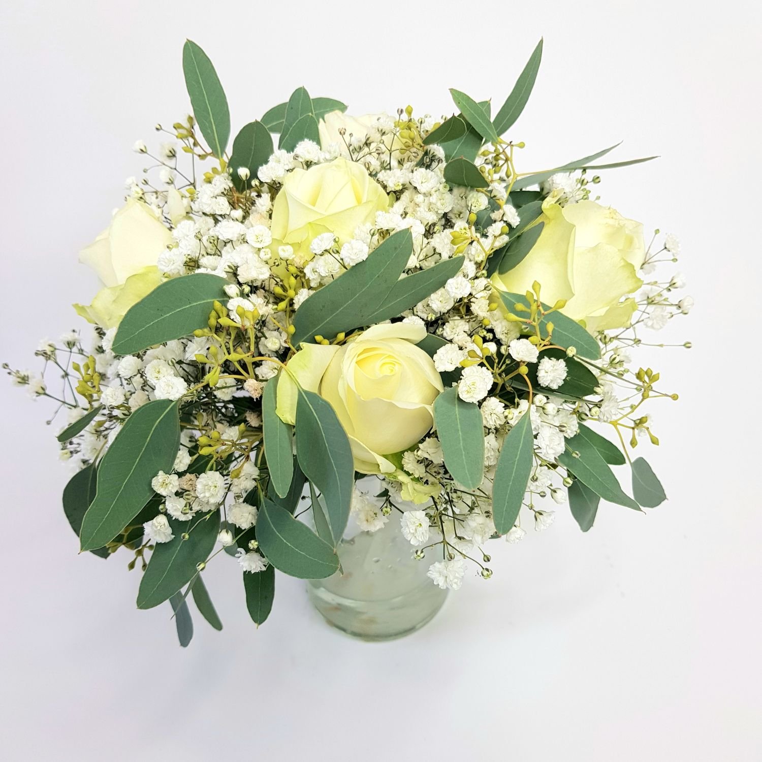 Svatební květina pro svědkyni nebo matku číslo 6. je tvořena z bílých růží, gypsophilou a eucalyptusu. Kytice by se měla skládat ze stejných květů jako je svatební kytice.