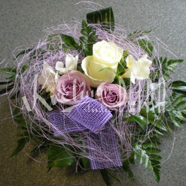 Svatební aranžmá na stůl číslo 75.A. je tvořeno z bílých a fialkových růží a bílou fresií. Květy jsou doplněny stuhou, zelení a kokosovým vláknem. Květy jsou vypichovány do misky kde je nasáklá hmota vodou a proto květy dlouho vydrží. Květiny na svatební stůl - svatební tabule.