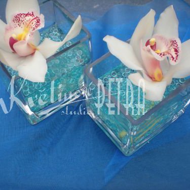 Svatební aranžmá na stůl č. 67.A je tvořeno z průhledné vázy, dekoračních kamínků a jedním květem orchideje. Toto aranžmá je v poslední době velmi oblíbené pro svojí jednoduchost a modernost. Aranžmá se dá vytvořit i v jiných barvách i s jinými květy.