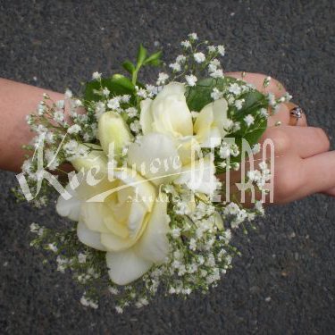 Květinová dekorace na ruku číslo 2. nebo-li květinový náramek se tvoří vždy z květů co má nevěsta ve svatební kytici. Květy se lepí speciálním lepidlem na živé květy a vždy se ještě zafixují speciálním postřikem proti vypařování vody. Tato dekorace se hodí na svatby : pro družičky, svědkyně nebo maminky. Ale také takovou květinovou dekoraci můžeme využít na plesy.