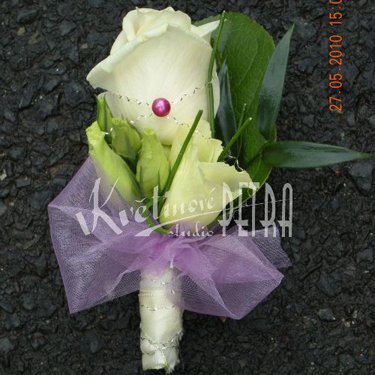 Korsáž pro ženicha číslo 2. Tyto dekorace se tvoří vždy z jednoho dominantního květu, který je ve svatební kytici. Kytička pro ženicha se dává do klopy a nebo se špendlíkem přichytí na kapsičku u saka na levé straně.