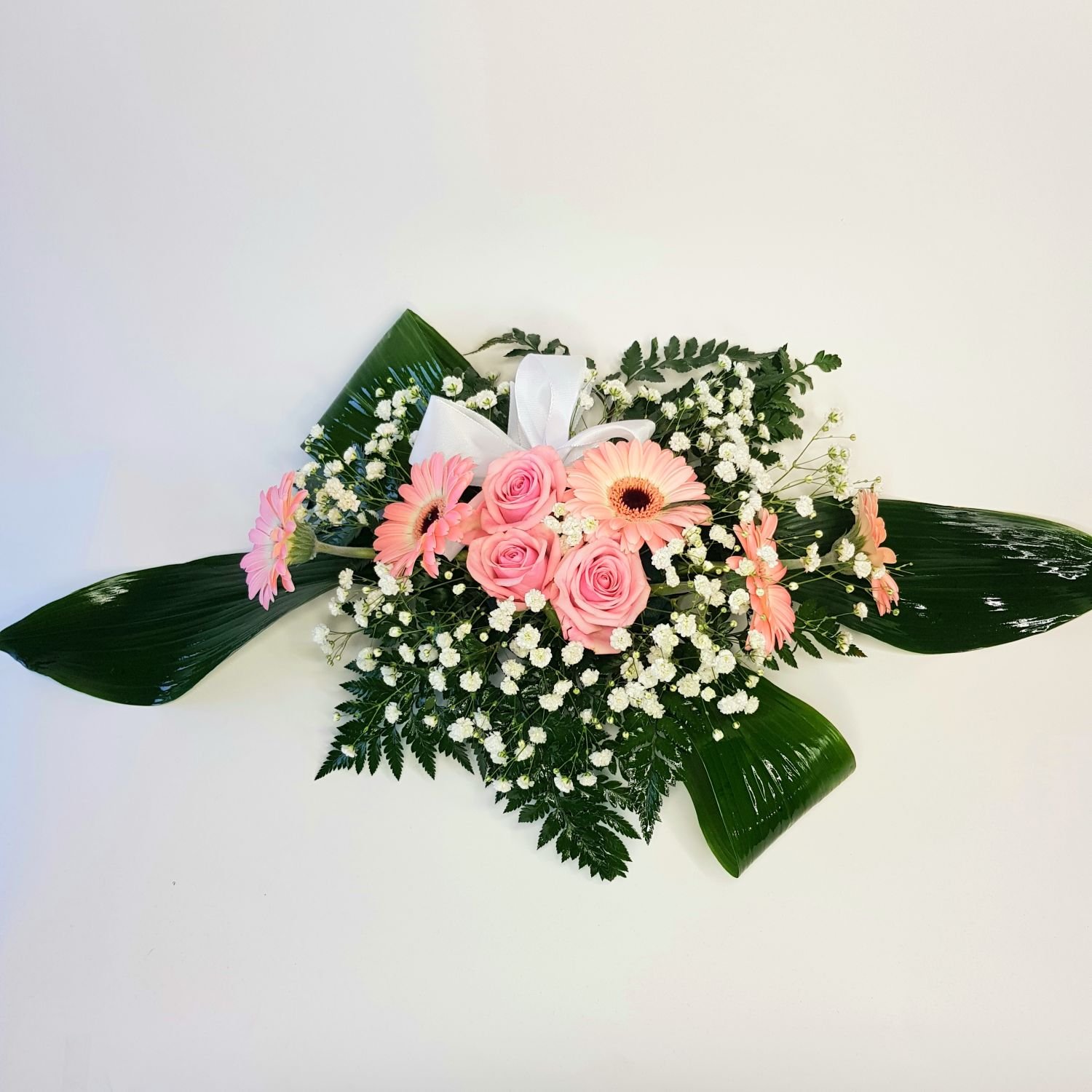 Svatební aranžmá na stůl číslo 35. je tvořena z růžových růží, růžových mini gerber, bílé gypsophily, bílé stuhy a zeleně.