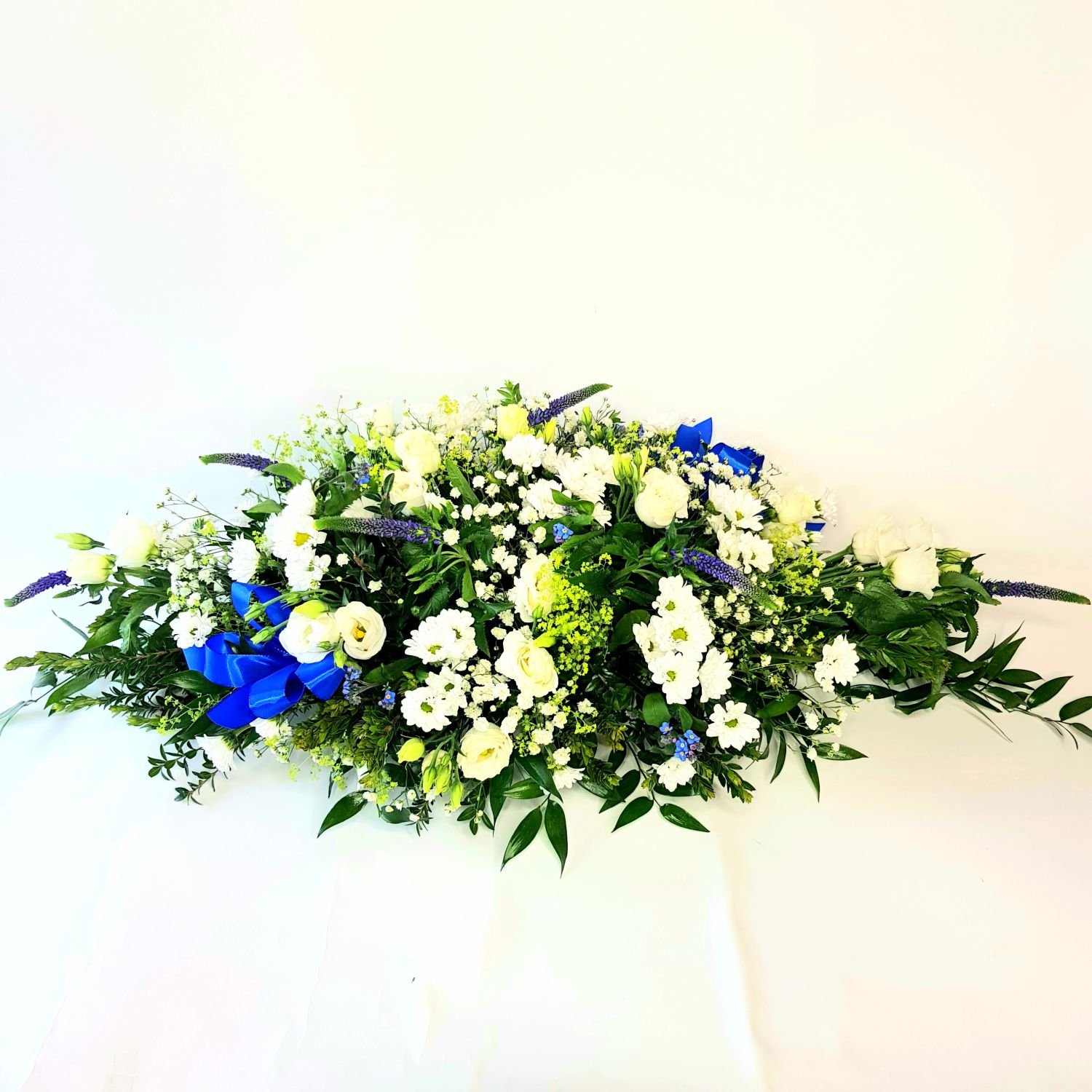 Aranžmá na stůl 31.A. je tvořeno z bílé eustomy, bílých chrysanthém, modré veroniky, modrých pomněnek a bílé gypsophily. Květy jsou doplněné zelení a stuhou. Vše je vypichované do hmoty, která je nasáklá vodou a proto květy dlouho vydrží.