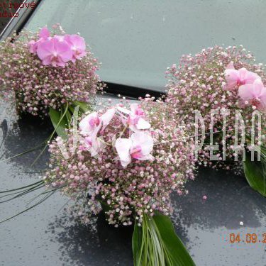 Aranžmá na auto katalogové číslo CXV je tvořeno z růžové gypsophily, květy phalenopsisu, bergrasem, listy aspidistry, růžovou perličkou. Toto aranžmá je extravagantní a proto se hodí na nějaké luxusnější auto.