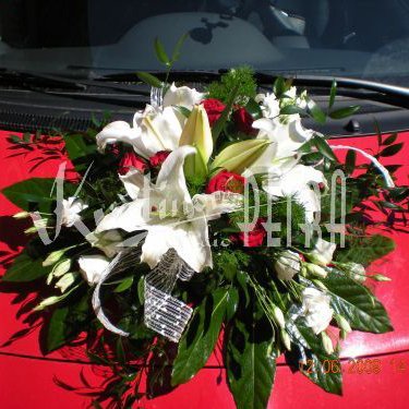 Aranžmá na auto katalogové číslo CX je vytvořeno z bílých lilií, červených růží, bílou eustomou, bílou stuhou a zelení. Toto aranžmá se hodí na menší auto třeba i v červené barvě.