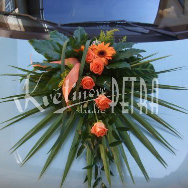 Aranžmá na auto katalogové číslo XLVII je tvořeno z dominantního palmového listu, oranžových růží, oranžových gerber, solidaga, stuhou a zelení.