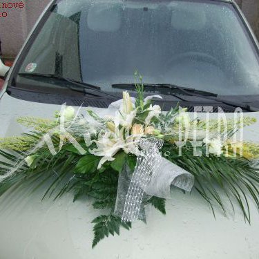 Svatební aranžmá na auto katalogové číslo LIX je vytvořeno ze žluté kniknofie, krémové eustomy, bílé lilie, krém. růží, bílé stuhy, bílé netkané textilie, bílého kokosového vlákna a doplňkovou zelení. Toto svatební aranžmá se hodí na menší auto, jelikož není velkých rozměrů.