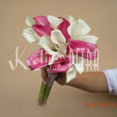 Svatební kytice žezlo číslo 336. je tvořena za dvou druhů kall a to z bílé a růžové, které spolu vytvářejí romantický dojem. Kytice je dolpněna bergrassem, stuhou a perličkou. Tato kytice se hodí k jednodušším šatům. Může jí mít i nevěsta s menší postavou, jelikož délka kytice se řídí podle výšky nevěsty.