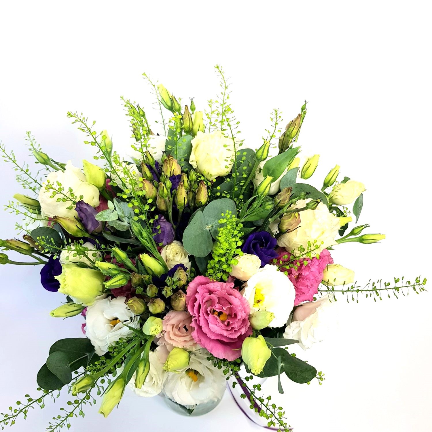 Svatební kytice číslo 351. je tvořena z různobarevných eustom, které jsou doplněné zelení a stuhou