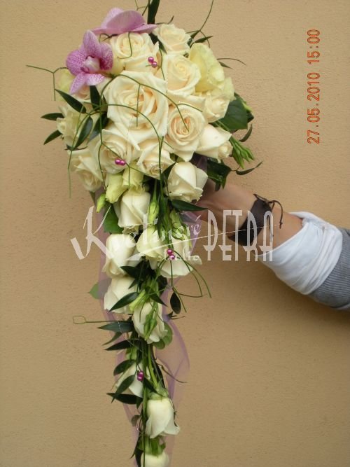 Svatební kytice převislá číslo 353. je tvořena krém. růžemi, květy phalenopsisu a zelení. Tento druh svatební kytice se hodí pro vyšší nevěstu. Tato kytice je velmi elegantní a velmi oblíbená.