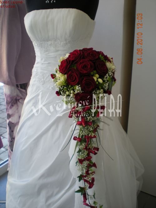 Svatební kytice převislá číslo 354. je tvořena z tmavě červených růží, doplněna je gypsophilou, ozdobným drátkem a zelení. Převis je vytvořen z okvětních plátků růží. Tato svatební kytice se hodí k bílým šatům princesového stylu. Tento druh svatební kytice je velice elegantní.