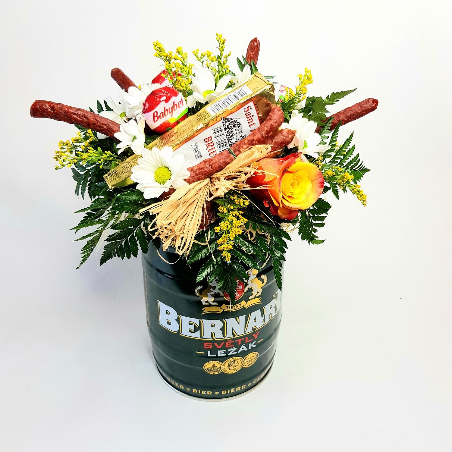 Květinové aranžmá pro pány Bernard je tvořeno z 5l soudku piva značky Bernard, který je přizdoben klobáskami, sýry, květy a zelení. Tento produkt prosím objednávejte alespoň dva dny před datem doručení či vyzvednutí.