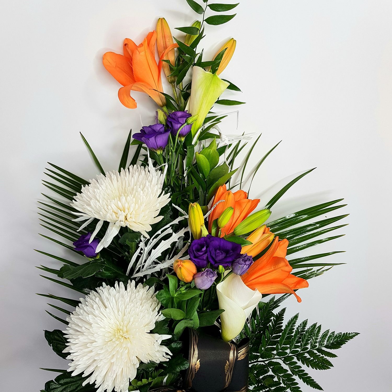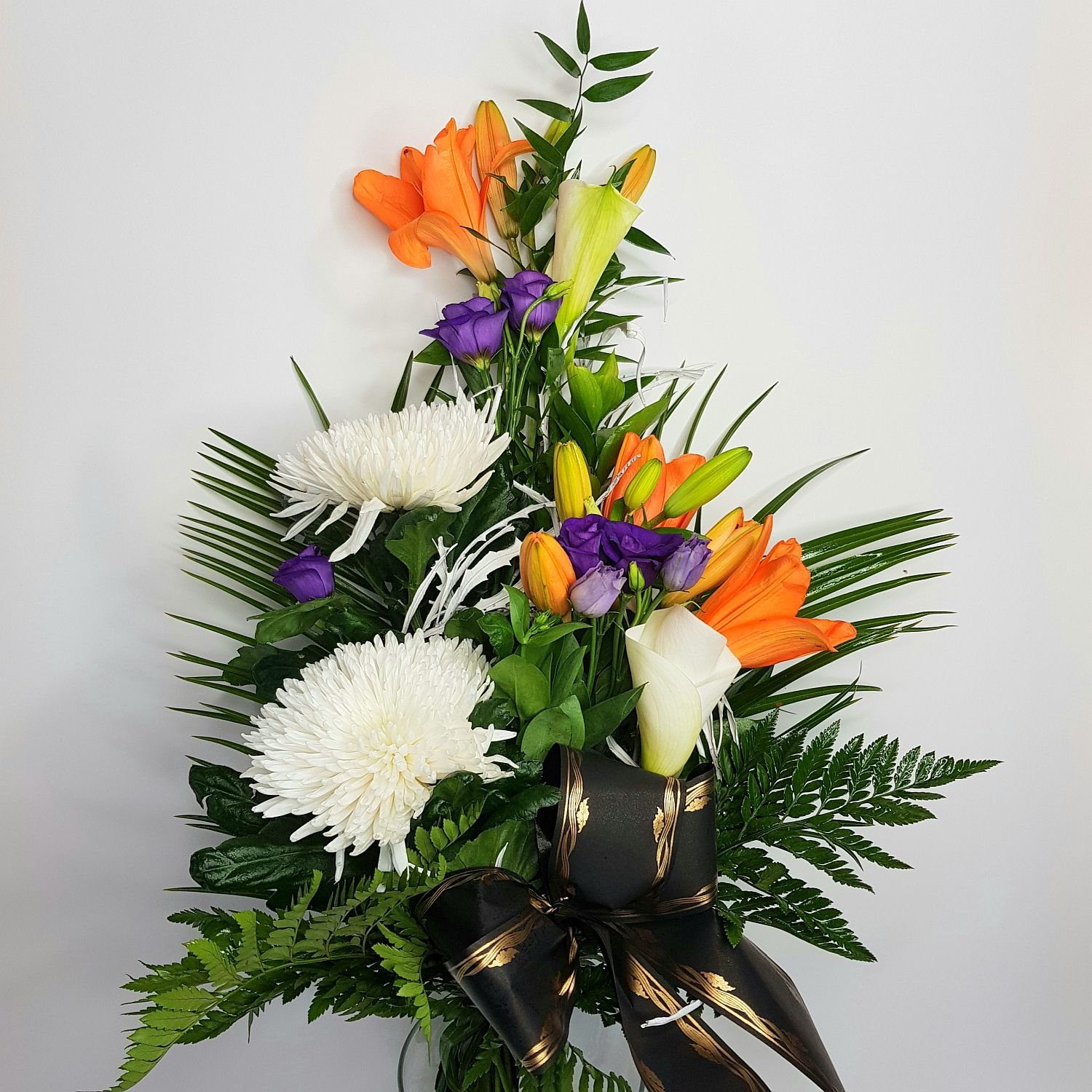 Smuteční kytice vázaná v ruce číslo 27. je tvořena z oranžových lilií, bílých chrysanthém, bílých kal a tmavě fialové eustomy. Květy jsou doplněné zelení a smuteční stuhou s nápisem dle Vašeho přání.