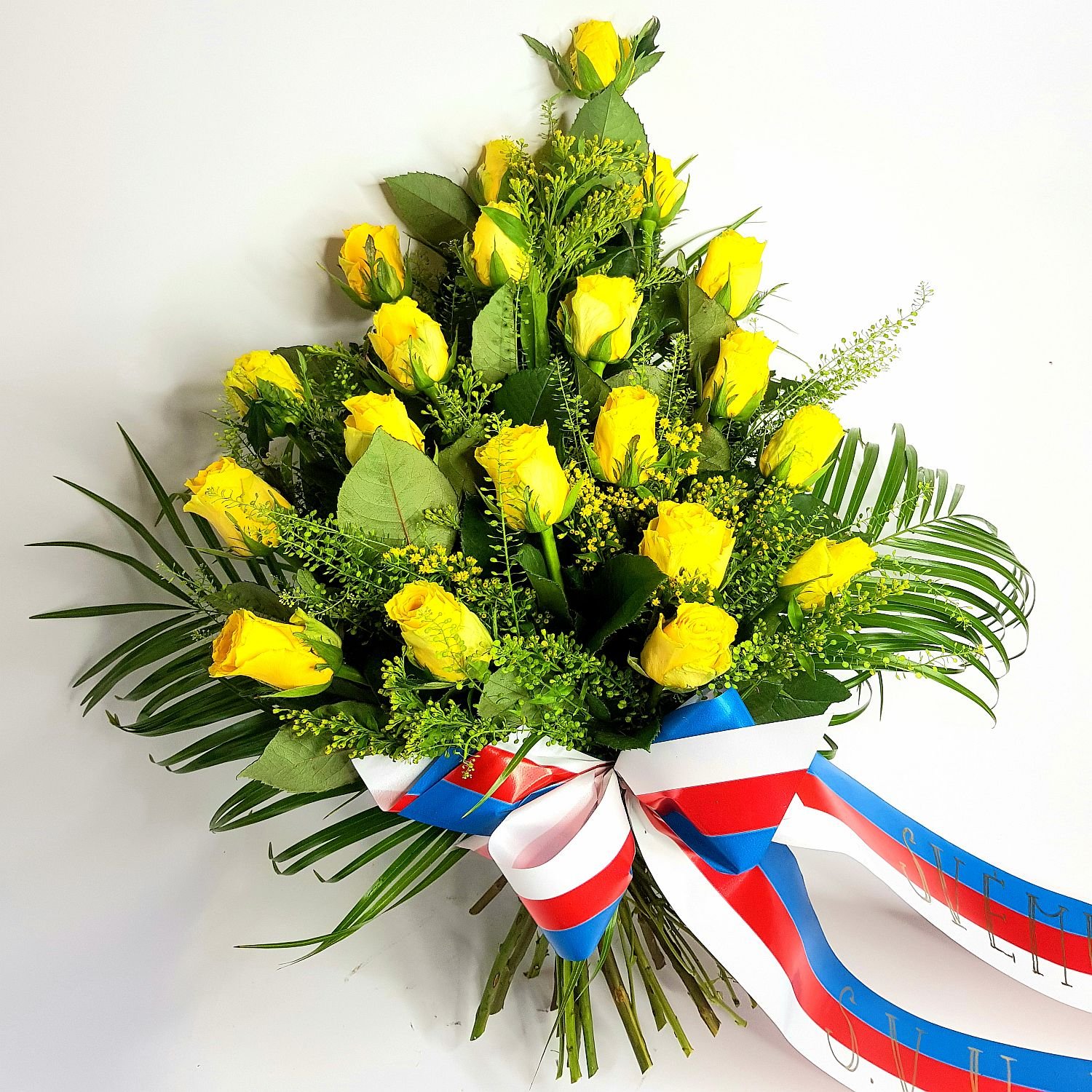 Smuteční kytice vázaná v ruce číslo 24. je tvořena z 20ti žlutých růží, které jsou přizdobeny solidagem a zelení. Na smuteční stuhu Vám napíšeme text dle Vašeho přání.